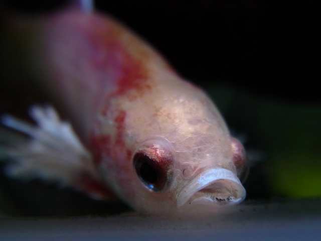 こんな体ですが、私が水槽に近付くと餌の催促をし、毎日病気に罹る前と同じ量の餌を食べています。